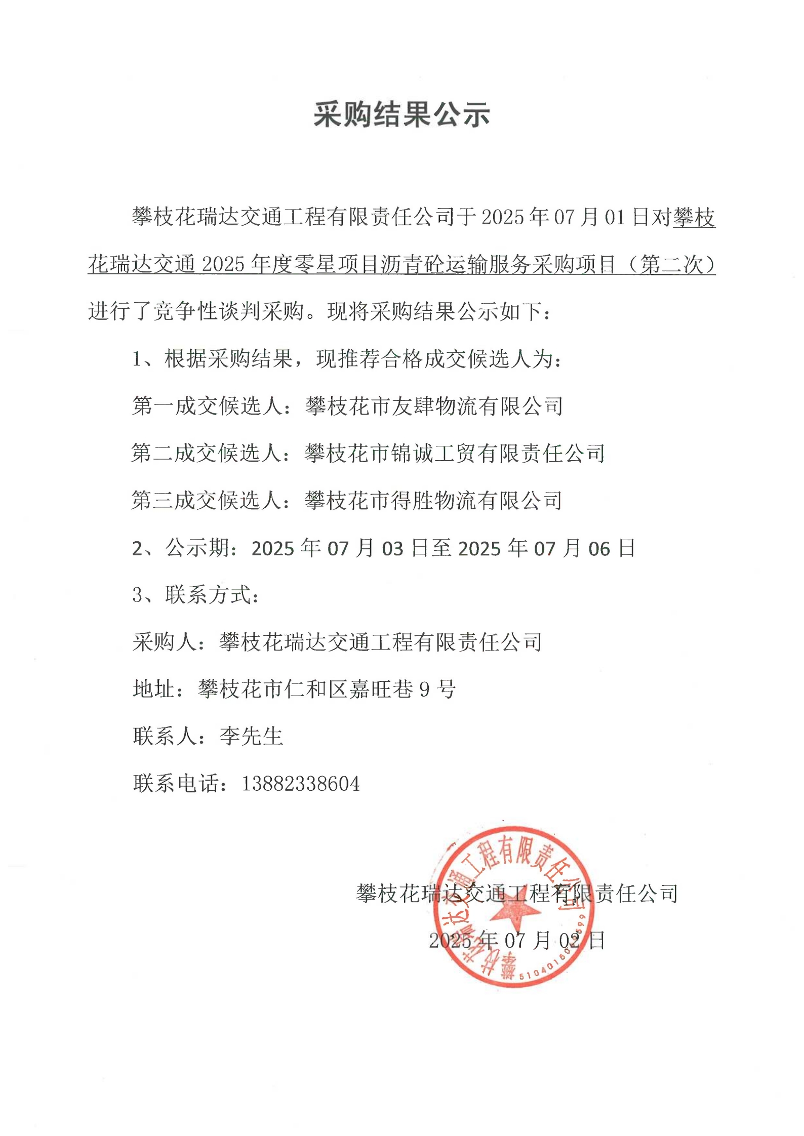 攀枝花瑞達(dá)交通2025年度零星項(xiàng)目瀝青砼運(yùn)輸服務(wù)采購(gòu)項(xiàng)目(第二次)采購(gòu)結(jié)果公示